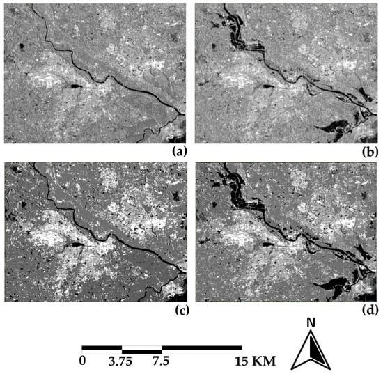 (a) Pre-flood and (b) post-flood post-processed dual-polarized Sentinel-1 VV amplitude; (c) pre-flood SAR segmentation; and (d) post-flood SAR segmentation.