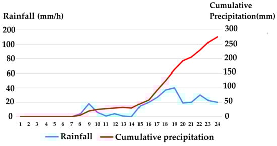 Future climate projections underscore the need to evaluate how global warming may escalate tropical cyclone-induced hazards, as Typhoon Hagibis exemplifies []. Within Japan’s “Impact Assessment Program on Disaster Intensification Due to Climate Change”, preliminary simulations indicate that cyclone-associated rainfall over Honshu increases notably under a 4 °C warming scenario, with smaller yet appreciable gains at 2 °C []. However, refining these estimates continues to prove challenging, owing to difficulties in accurately modeling tropical cyclone development and tracks, including central pressure shifts. Multiple climate models and integrated flood and storm surge simulations are recommended to address these complexities, enhancing predictions of river flow, flood levels, and tidal surges. Figure 6 provides a summary of concerns regarding the heightened risk of various water-related disasters, driven by rising air and sea temperatures linked to global warming. In line with such guidance, the present study intensifies Hagibis’s precipitation and tide parameters to reflect future warming trajectories. Specifically, rainfall in 2050 is projected to increase by 10% under RCP 2.6 (approximately 2 °C of warming) and 30% under RCP 8.5 (approximately 4 °C), as the Ministry of Land, Infrastructure, and Transport reports []. According to the IPCC Special Report on the Ocean and Cryosphere (SROCC), sea levels may rise by 0.25–0.30 m by mid-century and continue accelerating, compounding storm surges anticipated to increase by 0.20–0.30 m []. Meanwhile, observed data from the Naka River’s downstream station record a maximum high-water mark of 2.7 m during Hagibis, and peak precipitation rates have been documented at 40 mm/h. Figure 7 shows the amount of precipitation pattern observed by the Japan Meteorological Agency (JMA) at the observation site “Daigo”, located about 50 km north of Mito City, on 12 October []. These empirical benchmarks are incorporated into the typhoon’s intensified climate scenarios in DioVISTA 3.5.0 software, enabling a more reliable simulation of future cyclonic impacts under evolving environmental conditions.