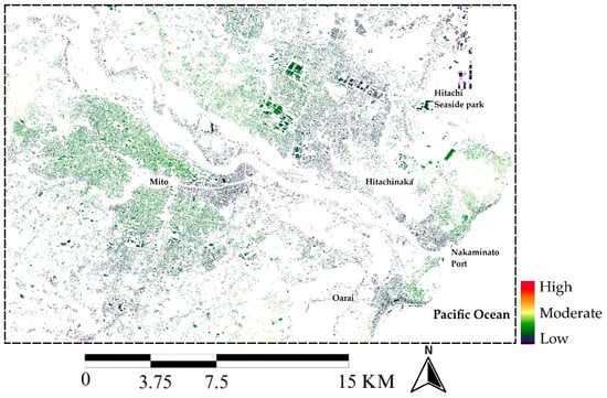 Additionally, we incorporated ASTER satellite data from 2007 and 2023, as well as a Digital Elevation Model (DEM) with a 5 m spatial resolution obtained from the Geospatial Information Authority of Japan. Spatial population distribution data from WorldPop, managed by the School of Geography and Environmental Science at the University of Southampton, were also used []. Further, we included data on vacant house distributions provided by the Mito City Plan for Vacant Houses [] and SAR images from Sentinel-1 for 2019. High-resolution digital elevation and digital surface models provided as the AW3D Enhanced DEM/DSM products [] were employed to identify high-rise embankments in the study area. Lastly, data on medical center locations and disaster danger zones (polygons) were sourced from the National Land Information Division, National Spatial Planning and Regional Policy Bureau, Ministry of Land, Infrastructure, Transport and Tourism (MLIT) of Japan []. At last, we used the Extract by Mask tool to standardize the spatial extent and pixel size of all datasets to match the 10 m resolution of the JAXA-classified map for the study area. All data sets used, and their detailed descriptions are listed in Table 1.