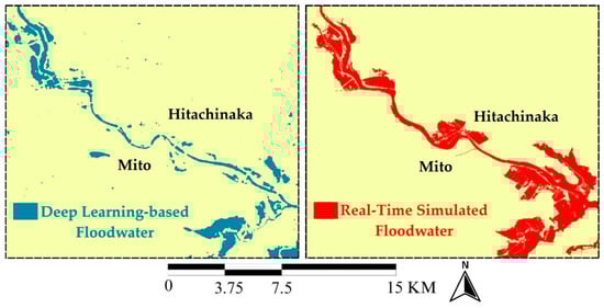 While the SAR-based deep learning approach surpasses DioVISTA in overall accuracy (0.85 vs. 0.81), F1 score (0.85 vs. 0.79), and Matthews Correlation Coefficient (0.70 vs. 0.64), it exhibits lower sensitivity (0.87 vs. 0.90). This indicates that the SAR model is more precise as it closely aligns with GSI results, likely due to their shared reliance on observational data. But may miss some true flood areas, resulting in higher false negatives, whereas DioVISTA casts a wider net, capturing more actual flood zones at the expense of more false positives. This divergence highlights a fundamental trade-off between model precision and sensitivity. The SAR-based model’s higher precision suggests it is adept at correctly identifying flooded areas when it predicts a flood, minimizing false alarms. However, its slightly lower sensitivity means it might overlook certain flooded regions, potentially due to limitations in satellite imagery interpretation under complex environmental conditions or to conservative optimization of deep learning that penalizes false positives heavily []. Conversely, DioVISTA’s higher sensitivity stems from its physics-based simulations that consider hydrodynamic factors, enabling it to identify more true flood areas and making it suitable for scenarios where missing a flood carries greater risk. This prioritization aligns with a safety-focused, risk-averse approach, ideal for highly flood-prone regions. However, this comes with increased false positives, perhaps due to overestimations inherent in its modeling assumptions. In addition, DioVISTA relies on forward modeling, making accurate model designs and input data, such as levee structures and flow rates, which are critically important for generating predictions by altering these inputs. In contrast, the SAR method employs results-based mapping, detecting actual inundated areas from satellite imagery and offering real-time validation or refinement of forward-model outputs. GSI’s inundation data is also results-based, so it aligns more closely with SAR findings. It is also worth noting that SAR imagery may misclassify buildings with high backscatter as inundated, while GSI explicitly interprets buildings and addresses this issue. Moreover, the results-based mapping depends on how “inundation” is defined; for example, SAR might exclude paddy fields unless the backscatter changes significantly, whereas GSI includes them if water is visibly present.