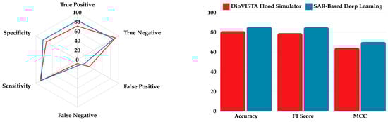 The comparative analysis revealed that SAR-based deep learning outperformed DioVISTA 3.5.0 in most evaluation metrics but exhibited lower sensitivity. Specifically, the SAR model achieved both an accuracy and F1 score of 0.85, along with a Matthews Correlation Coefficient (MCC) of 0.70. While DioVISTA’s overall accuracy was comparable to SAR’s, it demonstrated higher sensitivity, attributed to its lower rate of false negatives. This enabled DioVISTA to identify more true flood areas, albeit with a trade-off of a higher false positive rate. The detailed accuracy assessment results are presented in Figure 10.