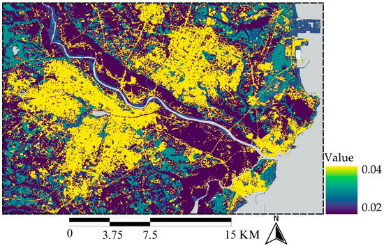 In flood simulation, while an ideal approach would involve incorporating detailed representations of topographic structures, a more practical and commonly used method is to represent land use through roughness coefficients. The Manning roughness coefficient varies based on land use types, capturing the differing resistance levels encountered across various environments, such as densely built urban areas. To derive roughness parameters for hydrological applications, we classified SAR data from two periods and incorporated JAXA’s LULC data to model projected land use changes in the study area for 2050. Subsequently, a roughness map was generated based on the coefficients in the Storm Surge Inundation Simulation Guide [,], published by the Coastal Office of the Water Management and Land Conservation Bureau, Ministry of Land, Infrastructure, Transport, and Tourism. According to this guideline, the roughness coefficients assigned to different land types are as follows: urban areas are assigned a coefficient of 0.04, paddy fields and croplands are 0.02, grasslands are 0.025, and forested areas are 0.03. Similarly, barren lands and water bodies are both assigned a coefficient of 0.025. The roughness Manning’s n values are presented in Table 3. The raster calculator tool within ArcGIS Pro was employed to produce the roughness map. The resulting roughness map, which serves as one of the inputs for the flood simulation, is illustrated in Figure 11.