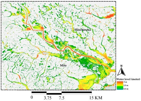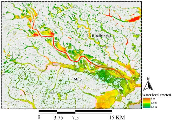 Optical remote sensing is an efficacious analytical tool that enables an understanding of floods. Tay et al. [] highlighted synthetic aperture radar (SAR)’s utility in rapid flood mapping during Typhoon Hagibis, producing Geographic Information System (GIS)-compatible data aligned with aerial and optical imagery for disaster analysis and modeling. Natsuaki and Nagai [] showed that consistent orbit and mode in pre-event SAR observations maximize flood detection accuracy, while deviations reduce it; however, synthesizing diverse data restores accuracy. Recent machine learning advances have enhanced disaster management methods. Adriano et al. [] combined convolutional neural networks (CNNs) and simulations to map flood depth, achieving acceptable accuracy in untested areas by linking depth to topography. Liu et al. [] used Sentinel-1 SAR images to assess Typhoon Hagibis flooding in Ibaraki, combining change detection for fully flooded areas with an index based on mean and standard deviation to map partial flooding, producing inundation maps validated against official data. Moriguchi et al. [] noted Usudaira’s resilience during flooding and landslides, with no casualties due to effective information sharing, timely evacuation, and strategic planning.