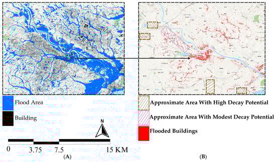 Integration of two simulation results: (A) overlay of flood and building maps, (B) flood-affected buildings and approximate decay potential areas.