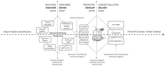 In particular, the first phase (which is expansive, aimed at investigating possible solutions) included several qualitative and quantitative methods (e.g., expert interviews, keyword analysis; see Figure 1, left side). In the following “contractive” stage of the process, we focused on defining the use case through sketching and prototyping and comparing with existing case studies (see [25] for a detailed recount). By applying the design checklist, we iteratively prototyped to define our concept solution, which is now a patented Utility Model, described in this paper. The next phase will involve the definition of the implementation parameters such as compliance with the city budget and urban regulations and the influence of the local climate, among others, toward a real-world testbed implementation.