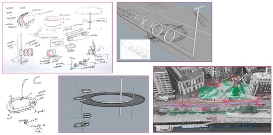 Once the design framework of reference (see Section 2.1) and the appropriate design tools (the Design Checklist, see Section 2.2) were defined, the team began to sketch and evaluate ideas and concepts. The third phase (Develop) is expansive and, as such, allows for the free contribution of ideas and generative drawing. The initial concepts that emerged aimed for a simple understated formal unit, i.e., the minimum formal element that would later be replicated as a system or network and installed at various points in the city to offer multiple solutions. We first explored simple components (such as ring-shaped elements; see Figure 4) that could cooperatively or parasitically anchor to existing city elements such as lampposts or trees to increase functionality while minimizing visual noise. Figure 4 shows some of the initial explorations. For further details, the reader can refer to [34].