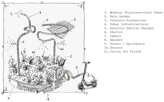 The opening where the foundation is located has an approximate diameter of two metres and can be adjusted according to specific needs. The circular opening is cut into the pavement, finished around its perimeter, and accommodates the rain garden. The aerial elements (Figure 9) are made of hollow stainless-steel tubes with a diameter of 50 mm and a thickness of 2 mm, adjustable as needed. The pieces are predominantly curved and modular, allowing for multiple configurations using standard compound units. The joints are made using a stainless-steel connector piece. Power and data run through the interior of the tubes and at the top and along selected points of the tube shaft functional elements such as sensors (e.g., temperature, light, sound, presence), cameras, lights, speakers, supports for covering elements, electric vehicle chargers, and other functional components can be housed. The reader can refer to Figure 8 to see how each of the elements is integrated into the design of Urban Oasis. The system’s fundamental components (elements 1, 2, and 3 in Figure 8) are as follows: