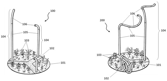 Figure 10 shows Urban Oasis’ infrastructure (100) with three different configurations of the hollow tubular supports (104). Each support includes at least one straight section (105) and at least one curved section (106). The length of each tubular section may vary, thereby creating supports of arbitrary shapes. The opening on the urban pavement that accommodates the rain garden is circular. However, other geometric shapes can be implemented in the design of the urban rain garden. The tubular supports are anchored at one of their ends to a foundation (102). This foundation extends from one edge of the circle defining the opening in the urban pavement where the rain garden is located to the opposite edge. In the arrangement shown in Figure 9, the foundation is Y-shaped, connecting points on the perimeter of the opening to a central area within it.