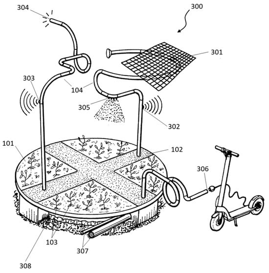 The project’s innovation and q1 patentability are justified as a contribution to the advancement of knowledge and the industrial application of innovative solutions for public spaces, directly linked to urban adaptability to climate change. While patents related to rain garden systems and urban drainage solutions already exist, Urban Oasis introduces significant novelty through the integration of smart urban technology with urban landscaping and climate adaptation solutions. The differentiating aspect lies in the integration of functional aerial elements within the hollow stainless-steel tubes, which not only serve as the furniture’s structure but also house all the technological components (e.g., sensors, cameras, lights, electric chargers, speakers). These elements are not described in current patents, granting the solution a competitive edge and patentability. Similar solutions, such as the HydroPlanter™ [43], are designed to manage stormwater by retaining and slowly draining rainwater. A clear example is patent US20220268008A1 [44], which describes a modular rain gardening system designed to be installed on hard urban surfaces, with the ability to join modules and increase stormwater management capacity. This system focuses on the permeability of the urban surface and flood mitigation, concepts similar to those of the Urban Oasis.