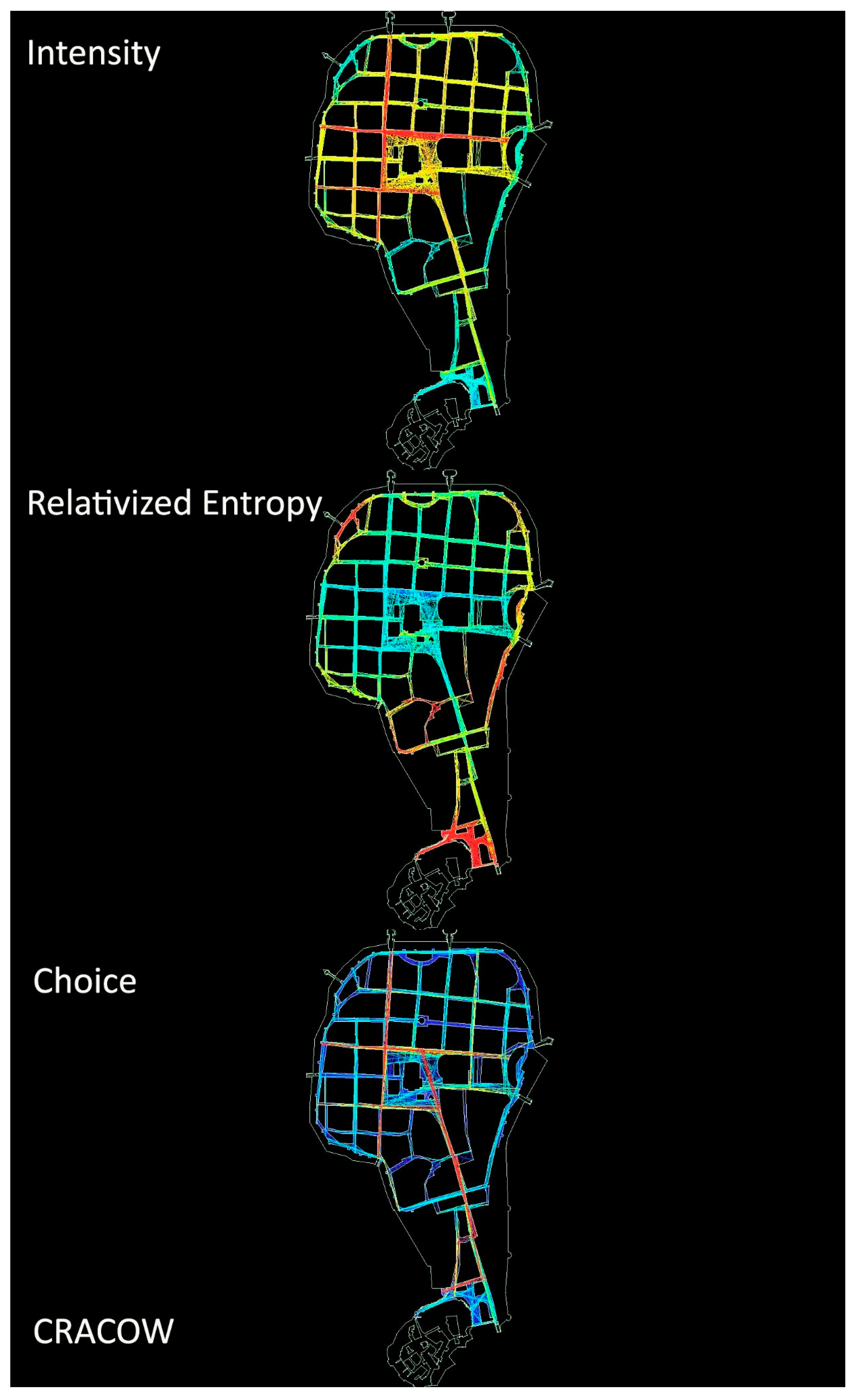 - Intensity—assesses reachability potential in key locations presented in normalized form, “It also aims to capture the movement efficiency given the distance one must travel in the network” [59]. As it is an alternative and more precise for calculations of integrations—the most reachable areas in urban structures which, if the model is working well, should coincide with the most functionally intensively used, the most important key areas of the spatial structure as business districts, market squares, etc.