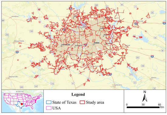 This study covers 201 cities in the Dallas-Fort Worth (DFW) metropolitan area in the state of Texas, USA (Figure 1). DFW, known for its sweeping suburban growth, is the largest (24,050.63 km2 across 12 counties), fourth-most-populated (7.8 million), and one of the fastest-growing urban regions in the U.S. Major cities in terms of population and area in the DEW include Dallas, Fort Worth, Arlington, Plano, and Irving. The DFW metropolitan area has a humid subtropical climate with hot and humid summers, although low humidity more characteristic of a desert climate can occur at any time of the year. High temperatures occur during July and August, with an average daily maximum of 35 °C and an average low of 24 °C. Winters in the DFW area are cool and mild, with occasional cold spells. January is typically the coldest month, with an average daytime high of 14 °C and a nighttime low of 2 °C, and the average annual precipitation in the DFW area is 993 mm [49,50,51].