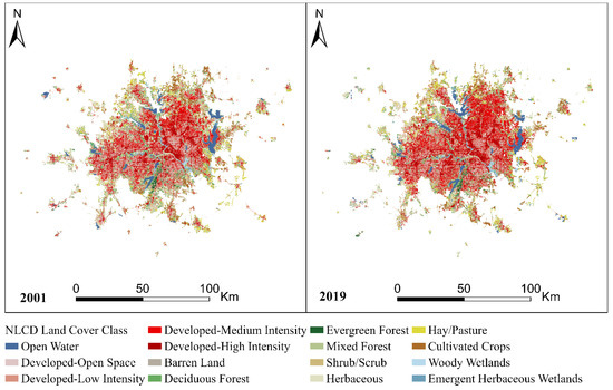 The climatic data of the study area for the years 2000 and 2018, the closest years to the NLCD datasets of 2001 and 2019, were obtained from WorldClim (https://www.worldclim.org/data/worldclim21.html, accessed on 15 August 2022). The variables used for this study are monthly minimum temperature (°C), monthly maximum temperature (°C), and monthly total precipitation (mm). The spatial resolution is 2.5 min (~21 km2). Each download is a “zip” file containing 120 GeoTiff (.tif) files for each month of the year (January is 1; December is 12), for a 10-year period. Since the climatic data for each month of a year were separate rasters, we combined monthly gridded data from all 12 months of a year to compute the monthly averages for minimum temperature, maximum temperature, and precipitation for that year. These new variables were named monthly average minimum temperature, monthly average maximum temperature, and monthly mean precipitation. The averaged raster datasets were utilized in the change detection analysis.