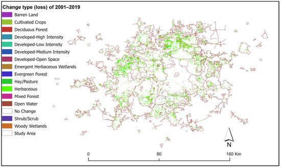 Mapped distribution of NLCD LCLUC (loss) by LULC class within the DFW metroplex study area from 2001 to 2019.