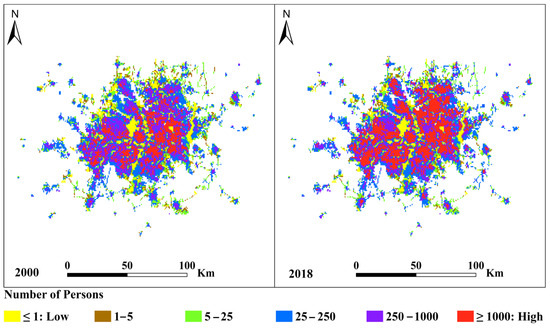 The population data of the study area was obtained from CIESIN’s GPW (https://doi.org/10.7927/H4JW8BX5, accessed on 10 February 2023). For developing GPW, population input data are acquired using the most spatially explicit resolution accessible from the outcomes of the 2010 round of population and housing censuses, which were conducted between 2005 and 2014. The input data are extrapolated to obtain population projections for the years 2000, 2005, 2010, 2015, and 2020. A set of projections, including historical and future population projections, was adjusted to the national level, from the United Nations World Population Prospects [46]. GPW are available in a variety of formats (ASCII, GeoTIFF, and NetCDF) and resolutions (2.5 arc-minute, 15 arc-minute, 30 arc-minute, and 1 degree). We utilized the latest version of GPW (GPWv4) in ASCII format, with a spatial resolution of 30 arc-seconds (approximately 1 km at the equator), to obtain population data for 2000 and 2020—the closest available years to the NLCD datasets of 2001 and 2019.