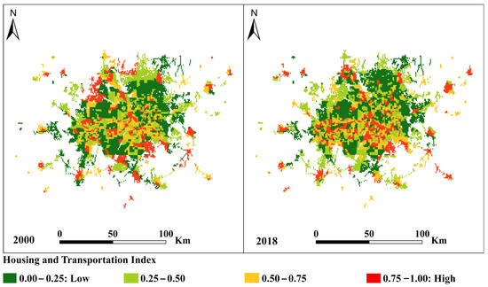 The mapped distribution of housing and transportation density is shown in Figure 6 and Table 4. for the DFW metroplex from 2000 to 2018. In 2000, 38.05% of the study area had a low index (<0.25) in terms of housing and transportation, while 17.47% of the study area had a high index (>0.75). However, most of the study area (44.48%) had an intermediate housing and transportation index (0.50–0.75). In other words, most of the research areas had a moderate index of housing and transportation structures. In 2018, the apportionment was relatively similar, though with a decrease in the low index of housing and transportation (35.59%), accompanied by a slight increase in the moderate index of housing and transportation (47.07%). The area of high-index structure for 2018 was like that of 2000, accounting for 17.37% of the study area. These results indicate that there was a visible shift in the spatial distribution of housing and transportation density, particularly in the northwestern part of the study area, where a decline from high to low index values was observed. This change may be attributed to factors such as suburban expansion, economic shifts, or zoning policies that influenced land-use patterns. It is possible that some high-density residential or transportation zones transitioned to lower-density areas due to redevelopment, shifts in infrastructure investment, or changes in housing demand. Additionally, this region might have experienced a decline in transit accessibility or an increase in vacant or underutilized land, leading to a decrease in the housing and transportation index.