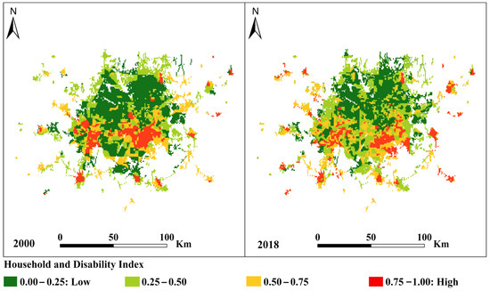 In Figure 7, the household and disability indexes derived from NASA SEDAC data are shown for 2000 and 2018. In 2000, 40.83% of the study area had low levels (<0.25) of household and disability, 11.88% of the study area had high index values (0.75 to 1.0), and the remaining portion of the metroplex (47.28%) had moderate values. In 2018, fewer areas had either low (32.74%) or high (13.31%) household and disability index values, associated with a greater area with moderate values (53.96%). Regarding changes in the household and disability status over time, approximately 45.44% (3695.80 km2) of the study area maintained a consistent status with “no change” from 2000 to 2018 (Table 5). Among the different intensity classes, class 2, characterized by a 0.25–0.50 intensity in household and disability, observed the most significant positive change with a gain of 355.94 km2. This suggests an overall shift toward moderate index values, possibly due to improved access to social services, demographic shifts, or changes in housing patterns that influenced household composition and disability prevalence. On the other hand, class 1, representing a 0–0.25 intensity in household and disability, experienced the highest negative change, with a loss of 630.84 km2 (Table 5). This decline in low-intensity areas may indicate that regions previously characterized by lower household and disability index values have undergone socioeconomic transformations, potentially due to urban development, increased housing density, or changes in population health dynamics. The shift away from the lowest index category further highlights a redistribution of household and disability characteristics across the metroplex.