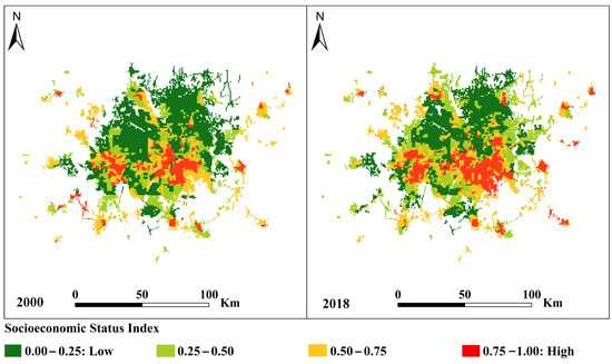 The U.S. socioeconomic datasets (e.g., socioeconomic status) in SEDAC contain gridded layers for the overall Centers for Disease Control and Prevention (CDC) for the years 2000, 2010, 2014, 2016, and 2018. The gridded layers’ values range between 0 and 1 depending on their percentile position among all census tracts in the U.S., with 0 representing the lowest value/vulnerability census tracts and 1 representing the highest value/vulnerability census tracts. SEDAC has gridded these vector inputs to create 1 km spatial resolution raster surfaces, allowing users to obtain socioeconomic metrics for any user-defined area within the U.S. Utilizing inputs from CIESIN’s Gridded Population of the World (GPW), Version 4, Revision 11 (GPWv4.11), a mask is applied for water and, optionally, for no population. The data are provided in two different projection formats: NAD83 as a U.S.-specific standard and WGS84 as a global standard [53]. The 2000 and 2018 datasets, the closest years to the NLCD 2001 and NLCD 2019 datasets, were used to calculate socioeconomic variables and their changes in the study area from 2000 to 2018.