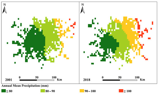 Mapped monthly means precipitation (mm/month) for the study area from 2001 and 2018 is shown in Figure 10. These data show that precipitation generally increases from west to east across the DFW metroplex. In 2001, precipitation ranged from 67.21 to 112.34 mm. Most of the study areas (49.76%) exhibited a mean precipitation value of 80 mm. In contrast, only 1.29% of the area, situated in the northeastern section, recorded a monthly mean precipitation exceeding 100 mm. For 2018, increased precipitation was found across the metroplex, with areas with high monthly mean precipitation increasing from 1.29% to 6.80%. The areas with moderate monthly mean precipitation, particularly those with 80–90 mm of monthly mean precipitation, increased significantly from 10.14% in 2001 to 27.36% in 2018 (Table 8).