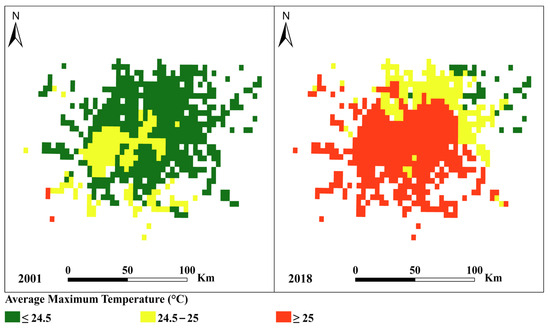 Mapped monthly average maximum temperatures (°C) for 2001 and 2018 are shown in Figure 11. These show that in 2001, the average maximum temperature ranged from 23.20 to 25.20 °C, with 76.01% of the study area having values of 24.5 °C. Only 0.48% of the study area experienced monthly average maximum temperatures of >25 °C. In 2018, more areas had higher monthly average maximum temperatures. The proportion of the metroplex with monthly average maximum temperatures over 25 °C increased from 0.48% to 68.92% (Table 9) in 2018, while average maximum temperatures of 24.5 °C decreased from 76.01% to 5.96%. This pattern suggests a shift toward generally higher maximum temperatures across the study area, likely influenced by urbanization, land surface changes, and increased heat absorption from impervious surfaces. The spatial distribution of these changes appears to resemble a heat island effect, particularly in urbanized areas with high population density and extensive infrastructure development. The concentration of high maximum temperatures in specific zones may also be attributed to localized land cover transformations, such as reduced vegetation and increased built-up areas, which enhance heat retention.