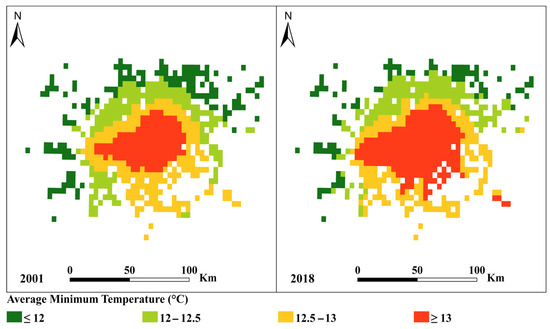 The monthly average minimum temperature (°C) for 2001 and 2018 is mapped and shown in Figure 12. The data show that minimum temperatures ranged from 11.40 °C to 13.77 °C. In 2001, 22.38% of the study area had monthly average minimum temperatures below 12 °C, 20.93% of the study area had temperatures above 13 °C, and 56.68% of the area ranged between 12 and 13 °C. In 2018, areas with monthly average minimum temperatures of >13 °C increased from 20.93% in 2001 to 35.10%, while areas below 12 °C decreased from 22.38% in 2001 to 14.49% in 2018 (Table 3). Areas with moderate monthly average minimum temperatures, between 12 and 13 °C, showed a minor shift, with a 6.28% decrease from 56.68% in 2001 to 50.40% in 2018 (Table 10). Unlike the maximum temperature distribution, the minimum temperature changes exhibit a distinct southwest-to-northeast gradient. This pattern may be influenced by prevailing wind directions, elevation differences, or proximity to water bodies, which can create localized cooling effects. Additionally, rural-to-urban thermal contrasts may contribute to the observed distribution, as areas with more vegetation cover and open spaces tend to experience lower minimum temperatures compared to densely developed urban zones. The differences in the spatial patterns of minimum and maximum temperature changes highlight the role of both large-scale climatic influences and localized urban effects in shaping temperature dynamics across the region.