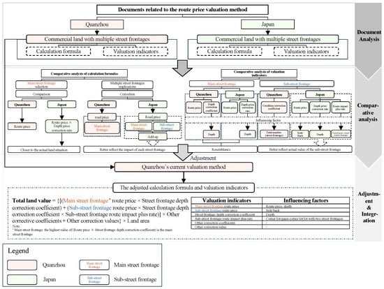 Then, the current route price valuation methods in China and Japan are compared through the comparative analysis method. The objective of this method is to compare the calculation formulas and valuation indicators, and the expected outcome is highlighting the main differences, especially the main and sub-street frontage-related valuation indicators.