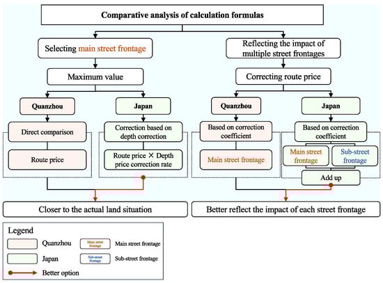 According to an analysis of the valuation methods of commercial land with multiple street frontages in Quanzhou and Japan, it can be seen that the differences between the two calculation formulas mainly lie in the selection of the main street frontage and how to reflect the impact of multiple street frontages (as shown in Figure 2).