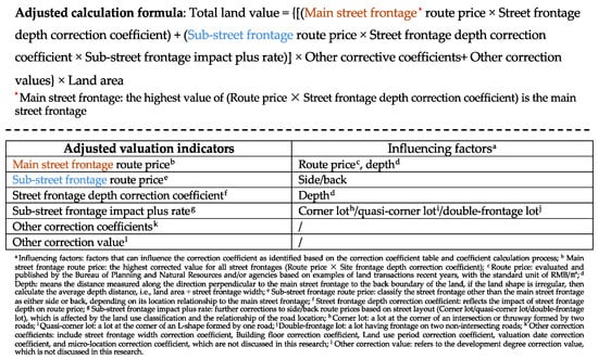 According to the comparison results mentioned above, the current valuation method in Quanzhou is used as the foundation for adjustment, so as to propose the valuation method with main street frontage route price and sub-street frontage route price as the main valuation indicators. The adjustments to the calculation formula and valuation indicators can be divided into three parts.