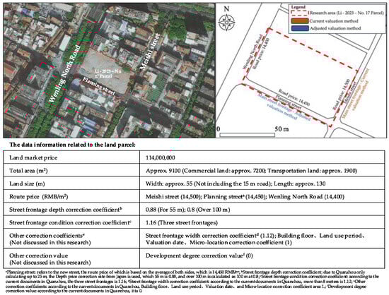To further clarify the application of the adjusted valuation method in practice, Li-2023—No. 17 Parcel is taken as an example (as shown in Figure 5), and the current valuation method and the adjusted valuation method are used to estimate the price and then compared with the actual land market price [11,80,81].