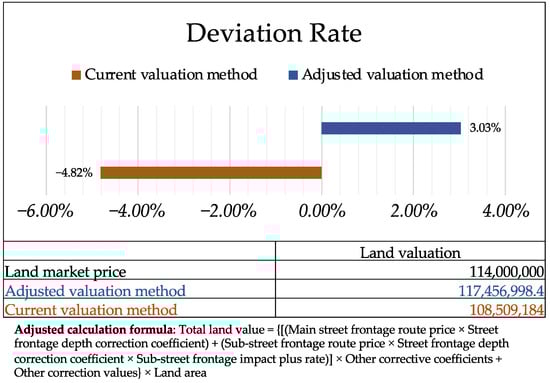 A comparison of the practical application of Quanzhou’s current valuation method and the adjusted valuation method shows that the adjusted valuation method is closer to the market price of land, which reduces the error of the current valuation method (as shown in Figure 6). The detailed data from the two methods can be compared to find that the choice of the main street frontage is the primary reason for the difference in valuation results. In addition, because the route prices of each street frontage in this case are similar, the two methods have different ways to calculate the impact of sub-street frontages, but the results are similar. Therefore, it can be clarified that the adjusted valuation method can help to choose the main street frontage with the highest value in the case of multiple street frontages, thus effectively distinguishing between the main and sub-street frontages. Moreover, bringing the sub-street frontage route price into the calculation process can directly reflect the impact on land value based on its route price, avoiding errors due to the large difference between the main and sub-street frontage route prices. Meanwhile, the adjusted valuation method can have a positive impact on multiple parties in practical applications. For example, the valuation results are closer to the current land market price, which can help landowners realize their land profit rights, thus avoiding the loss of profit due to the valuation; accurate differentiation of main and sub-street frontages can provide a more scientific and reasonable basis for assessment organizations and the government, which enhances the credibility of the valuation results.