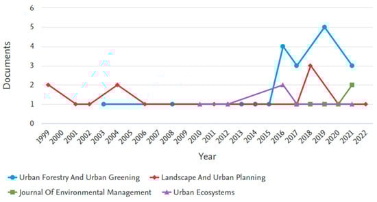 Figure 2. The most prominent sources have been identified, and the distribution among the top five sources appears to be fairly consistent, except for the journal “Urban Forestry and Urban Greening”. This source exhibited a steady increase in the quantity of documents published from 2015 to 2021. There were other noteworthy exclusions, including