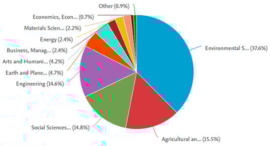 Figure 3 displays a pie chart illustrating all the topics within the sample. As observed, out of the entire sample, 37.6% of the documents are classified as being within the field of environmental sciences, 15.5% are connected to agricultural analysis, 14.8% are associated with social sciences, and 14.6% are categorized under engineering. These four domains together represent 82.5% of all the research areas identified in the sample. This underscores that the subject is approached from a cross-sectoral standpoint, with many of them incorporating both environmental and technical viewpoints.