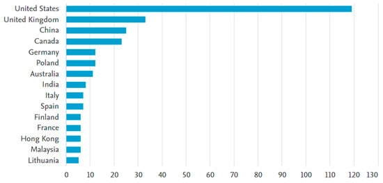 Figure 4 illustrates this with a bar chart, showing the various countries of origin for the 339 documents. The chart emphasizes the countries that appear most frequently, with a notable majority of documents originating from the United States, representing over one-third of the total. The second most common country is the United Kingdom, representing just under 30% of the total from the United States. China and Canada claim the third and fourth positions, being the only other countries with over 20 documents. Among the remaining countries, Germany, Poland, and Australia are the only ones that exceed the threshold of 10 documents each; in contrast, over half of the countries in the chart have published fewer than 10 documents each.