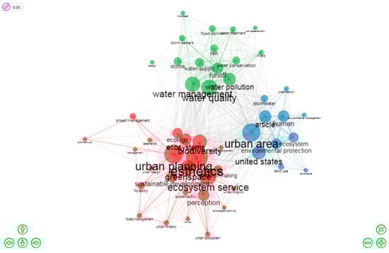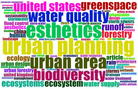 Figure 9 illustrates the occurrence of keywords noticed through the examination of the current dataset. As indicated, the most commonly occurring keywords in the sample include “aesthetics” (and “aesthetics”), “urban planning”, and “urban area”, highlighting their significant recurrence and interconnection. Additionally, other frequently observed terms are associated with culture, ecosystems, biodiversity, and resources.