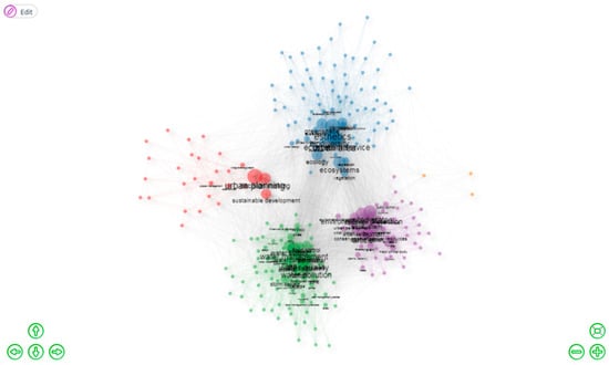 Figure 7, a mapping visualization of clusters is displayed, emphasizing the central topics related to key concepts. Results depicted in the drawing reveal the presence of two primary clusters that capture literature’s current interests. The first cluster revolves around cultural ecosystem services and aesthetics, which align closely with the attention to this analysis. In this cluster, organization and the provision of services are fundamental components that warrant in-depth exploration as they have the potential to be pivotal factors in urban management’s realm.