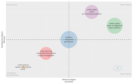 Naturally, the results align with the anticipated progression of research in this field. An intriguing observation is the absence of isolated themes, indicating a high level of interaction among diverse clusters and a notable level of density within these groupings. The only exception to this pattern is the orange cluster, which remains somewhat confined to its own limited subdomain. Other clusters exhibit adequate interaction, encompassing topics related to resource management, urban planning, environmental conservation, project management, and sustainable development (which is emerging as a noteworthy topic). Urban spaces and aesthetics occupy a central position in the study, underscoring the increasing significance of this research direction.