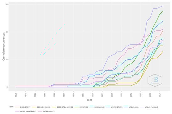 Figure 10. Following the previous approach, we have divided the period of five years to provide a comprehensive perspective. With the exception of the initial two terms with no available data recorded, we begin to observe a subtle increase in the usage of certain keywords starting from the third term (1986–1990). This uptick is primarily related to water management and quality. For the subsequent term, from 1991 to 1995, the situation remains relatively stable. However, we see a noticeable surge in interest from 1996 to 2000, with the previously mentioned keywords gaining even more significance. Moving into 2001, there is a growing debate on new concepts, particularly green space and aesthetics. This information is consistent with the topics covered in the preceding sections, aligning with the primary attention to this analysis. The interconnection between these fundamental conceptions started to appear in academic literature at the start of the 21st century. During the span of five years spanning from 2006 to 2010, issues connected to sustainability made their way into the discourse, with keywords associated with ecosystems and a consistent uptick in mentions of aesthetics and green space. Additionally, other intriguing subjects, such as decision-making and project management, begin to gain attention. In the current state of research, it is evident that the most frequently used keywords, which have maintained a robust upward trajectory since the outset, are those related to urban planning and aesthetics, underscoring their central position in this analysis.