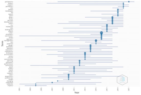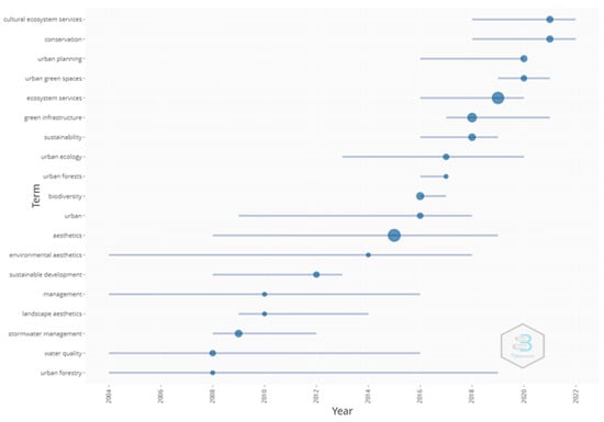 Figure 11 illustrates the frequency of keyword usage in the documents within the sample. Each word is depicted as a circle, and its placement on the chart corresponds to when it gained prominence in academic discourse, with more recent trends positioned higher. The first instance of the term “aesthetics” is associated with “landscape aesthetics”, which first appeared in 2009 and saw increased usage in 2010. This initial focus on “landscape aesthetics” primarily pertains to urban management’s hardware aspects as it relates to the landscape’s visual appeal. The notion of “environmental aesthetics” began to emerge in 2004 but did not gain significant traction until 2014. It served as a precursor to the broader notion of aesthetics. These earlier concepts have gradually evolved into more hybrid ideas, such as “ecosystem services” and “cultural ecosystem services.” These contemporary terms are now at the forefront of academic interest and are considered cross-sectoral concepts that encompass both hardware and software components of landscaping and urban management. When examining the overall trend topic analysis, it is evident that these keywords represent the most current topics that are generating the greatest academic attention. They are inextricably refer to sustainability, conservation, and urban planning.