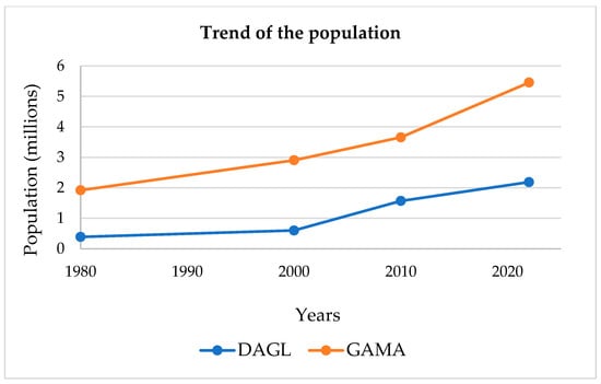 From 1980 to 2022, there have been significant increases in the populations of DAGL and GAMA (Figure 2). As of the latest estimates from the General Census on Population and Habitat [4], DAGL has a population of over 2 million people (2,188,376 inhabitants), with an annual growth rate of 2.6%. In contrast, GAMA has a population exceeding 5 million residents (5,455,692 inhabitants), with an estimated growth rate of 2.9% based on the Ghana Statistical Service [5]. DAGL lies on a geographic coordinate of 6°08′14′′ N latitude and 1°12′45′′ E longitude. Despite significant urbanization altering the landscape, DAGL’s environment still features savannah vegetation, herbaceous communities, mangroves, and a few forest islands [22,23,24,25]. DAGL is an economic hub with many sectors of activity, playing a crucial role in the country’s economy. Because of its strategic location on the Gulf of Guinea, DAGL serves as the chief port that facilitates trade with neighboring countries and concentrates over 60% of the national firms. Additionally, the informal sector is developed especially in DAGL due to the high rate of unemployment, with a dominance of women at 54% [26].