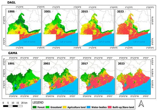 The results of the LULC change assessment of the classified maps in the DAGL and GAMA (Figure 4) reveal a significant transformation in land uses over the years.