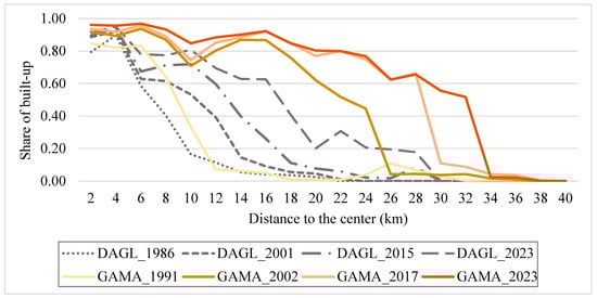It has been proven that there is an intimate relationship between urbanization and land use dynamism, with increased urbanization leading to significant changes in land use types and a more diversified land use distribution over time. Over the past three decades, built-up development in terms of residential and commercial purposes has significantly impacted urbanization in DAGL and GAMA. The share of built-up areas varies from the city center to the periphery, as depicted in Figure 5. The periphery has gradually transformed into sporadic residential buildings, demonstrating how cities typically develop around a central core characterized by dense concentrations of residential areas, historical and cultural sites, administrative buildings, hospitals, and commercial establishments. New developments generally expand outward from the city center, resulting in declining urban density. High density is concentrated at the core, while lower densities are found at the periphery. Contributing factors to this trend include high land prices and scarcity in the city core.