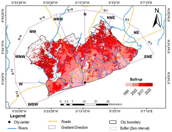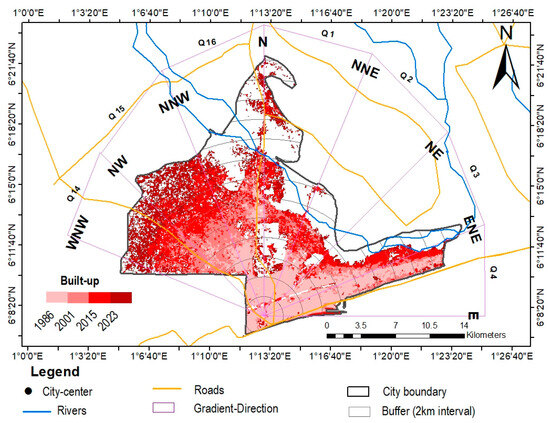 An urban built-up map was generated by extracting the built-up images from the classified images. Following the extraction, built-up maps were overlaid, and the resulting images were recorded. For each image in the two cities, the UEII, a crucial metric that shows the rate or speed of urban expansion at various times, was determined (Equation (3)). Around a selected center point, fourteen concentric multiple-ring buffer zones were constructed with 2 km intervals for DAGL, while twenty were constructed for GAMA. Independence Square, representing the city center, was chosen for DAGL, while the central business district, Makola Market Circle, was chosen as the center point for GAMA for generating the buffer zones. These points were generated from the Google Earth Pro interface. The 2 km interval is found to be an appropriate scale that captures the key spatial details of urban features, and the number of rings generated depends on the size and spatial extent of each city. Additionally, to identify the trend of urban spatial patterns in various directions, the direction-wise method has been used [37,38]. An equal interval of 22.5 degrees for each direction was used, which is very effective [39], and the study areas and the concentric ring were divided into sixteen directions. In order to quantify the expansion in different directions, a number of quadrants (Q) were generated and captured. There were some quadrants eliminated since they did not cover the study area’s boundaries. Finally, seven (7) and eight (8) quadrants were considered for DAGL and GAMA, respectively. The directional analysis reveals the area of the city that is expanding the fastest and identifies key factors or divers. This is crucial to know where natural habitats are most at risk to develop conservative strategies and guide planning for future expansion.