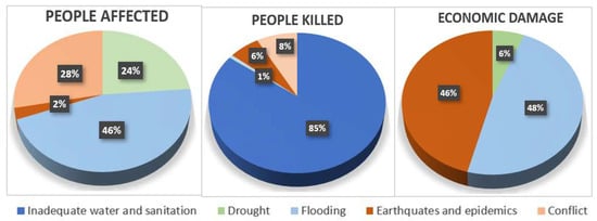 Cyclones, earthquakes, and tsunamis are natural hazards that can cause damage to people and property [18]. Hydro-meteorological hazards, like floods, droughts and landslides, are the most significant natural disasters [19]. However, floods are the most damaging of all natural hazards in urban areas in the world, producing different types of impacts, which can be physical, economic, social, environmental, short and long term, tangible, and intangible [20]. Figure 1 depicts the social and economic impacts related to flood hazards and improper water and sanitation services according to the report of the United Nations [21].