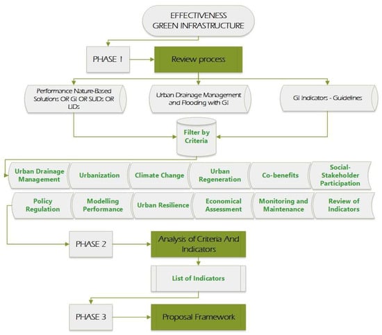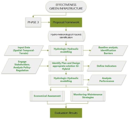This research aims to analyze methods, tools, guidelines, and indicators to propose a framework to prove the effectiveness of GI impacts considering hydro-meteorological hazards. To do so, this research explores, reviews and finds official reports, relevant articles, and scientific journals with DOI (indexed in JCR or SJR), which are related to concepts, procedures, parameters, designs, modeling, barriers, stakeholders participation, guidelines, policies and regulations, criteria, indicators and results of implementation, effectiveness, and performance of green infrastructure (GI).