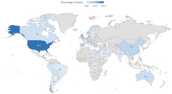 The publications found in the previous step under the fields mentioned were distributed in 41 countries (Figure 5).