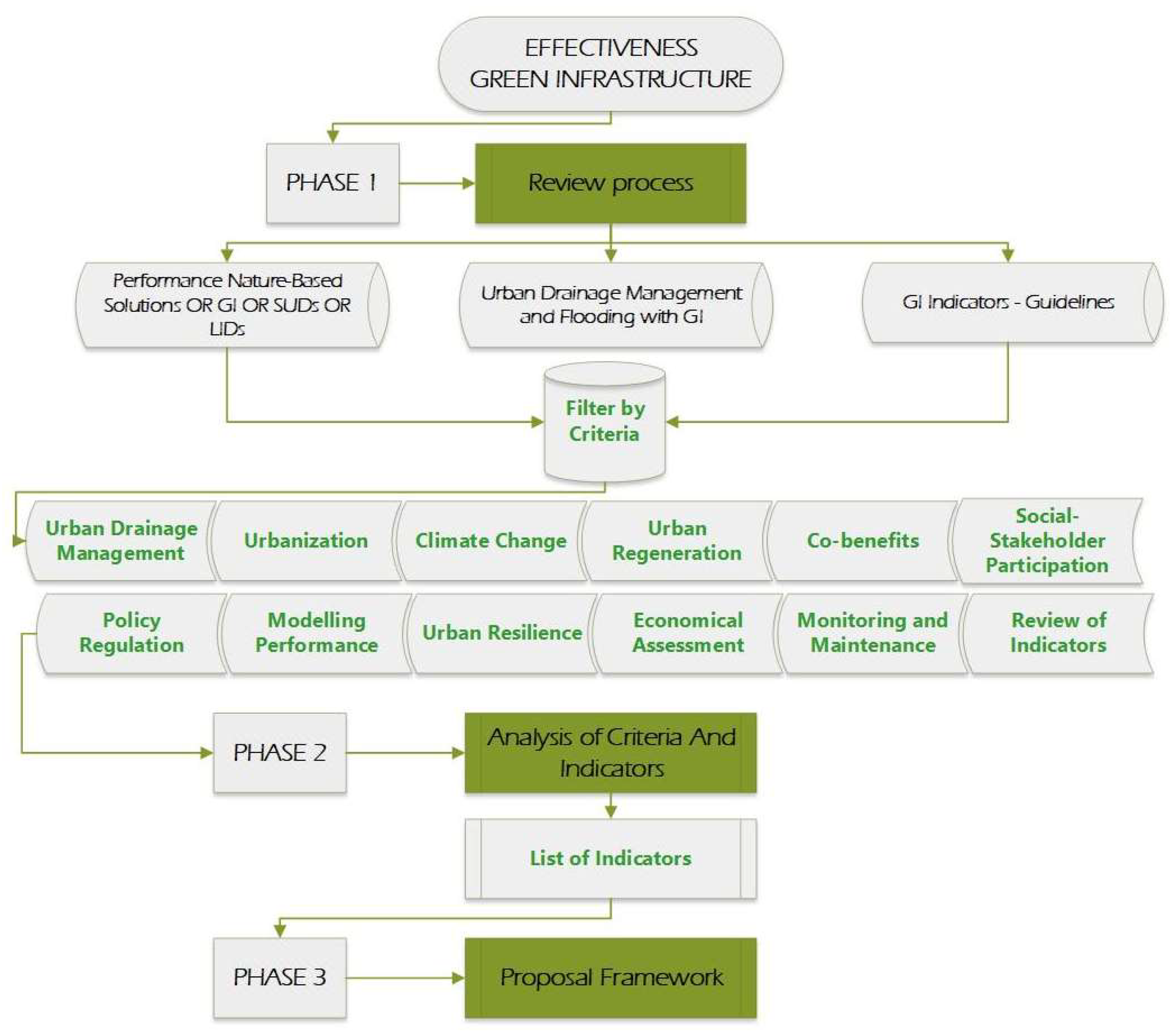 This framework is structured in three phases: in the first phase, a systematic literature review was carried out to retrieve and classify publications under twelve criteria. In the second phase, methods, tools and the most relevant indicators were identified from those scientific articles. Meanwhile, in the third phase, the framework involved several steps, which are interconnected with each other. The initial conditions (baseline) are evaluated by applying hydrologic–hydraulic modeling. Groups of stakeholders considering local conditions and needs, pressures that will be addressed, geology and geotechnical characteristics, and availability of policies should select and co-design the most appropriate GI and indicators. The results of the effectiveness of the GI project take into account both the analysis performance of indicators and the economical assessment.