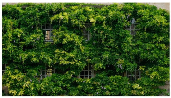 - Sova, U. A Building Covered with Many Green Plants. Unsplash. Available online: https://unsplash.com/it/foto/un-edificio-ricoperto-da-tante-piante-verdi-4WBEtOhi2nk (accessed on 28 March 2025).