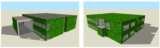 In order to evaluate the impact of green wall and roof applications, an ivy species called Hedera canariensis gomera is used on the building in two scenarios: (1) applying plant to only walls; (2) applying plant to the walls and roof (Figure 4). Moreover, while Hedera canariensis gomera is applied to the walls in both scenarios, twenty-one different plant species are used on the roof for scenario 2. These plants are applied to whole opaque façades of the building.