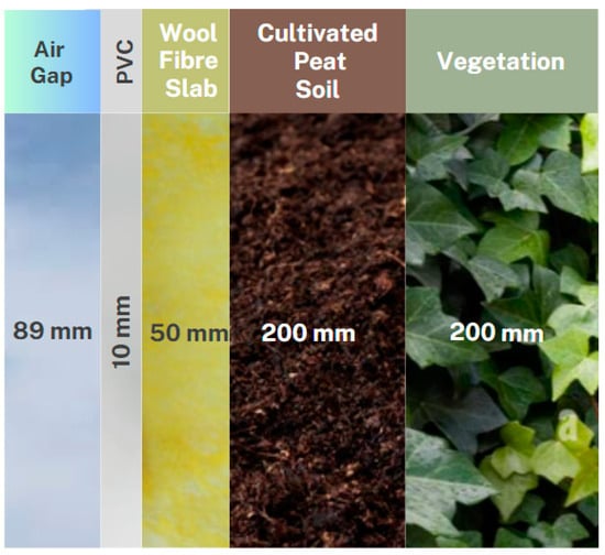Figure 5 depicts the added layers for the applications of green walls and roofs to the baseline model. It is worth noting that a 200 mm vegetation layer is added after applying soil. From the inside to the outside, an 89 mm air gap, a 10 mm PVC, a 50 mm wool fibre soil, 200 mm of cultivated peat soil, and 200 mm of vegetation are applied over the existed wall and roof layers.