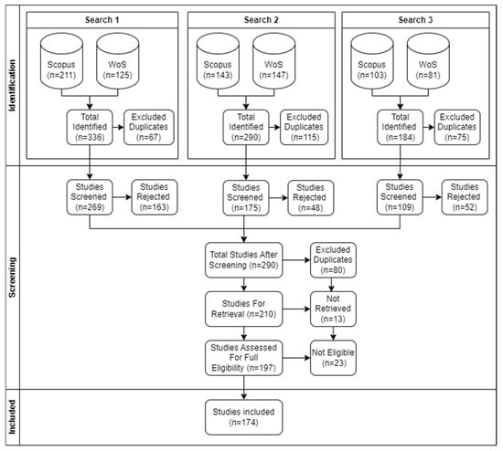 Figure 1 presents the PRISMA flow diagram of the inclusion of systematic literature review papers, which illustrates the entire screening and eligibility analysis process. It was prepared based on [14] and was adjusted to represent three search strategies (screened separately to evaluate search strategy effectiveness). First, a deduplication process was used to remove repeating studies between Scopus and Web of Science for every search type. Next, all papers were screened for relevance. The screening process included the title and the abstract review. In case the abstract showed that the study broke any of the eligibility criteria, the study was excluded without a full-text eligibility assessment. The deduplication process was used again to remove duplicates from different types of searches. This resulted in 210 suitable studies for complete eligibility testing. However, the authors could not retrieve the full-text versions of specific research; thus, 13 studies were excluded. Finally, a full eligibility assessment was conducted, and the same eligibility criteria were applied to all the contents of the studies. Most of the studies that ended up being excluded were quantitative as they either explored only a few regions or only had a single indicator to represent resilience, going against our view of regional economic resilience as a multi-dimensional phenomenon. The final number of studies included in this literature review is 174; they are presented in Appendix A, Table A1.