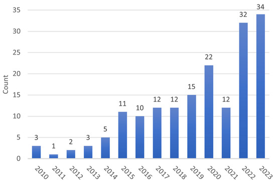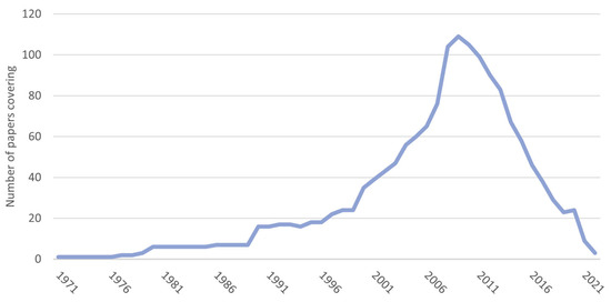 During searches, the earliest identified papers were published in 1990, but screening processes and the application of eligibility criteria moved the earliest eligible papers’ publication year to 2010. Figure 2 shows the count of papers included in this research by year. The number of papers grew from 2011 to 2023 (the last year for which papers were included). The dynamics of resilience papers, which matched our search criteria compared to the dynamics of overall published papers in Scopus and WoS, showed that the trend for the amount of regional economic resilience papers published every year grew faster than the total published papers in Scopus and WoS (based on publicly available data). In addition, Figure 3 shows the number of empirical papers covering each year in their analysis. Between 1971 and 2022, the three most covered years were 2008 (104 papers), 2010 (105 papers), and 2009 (109 papers).